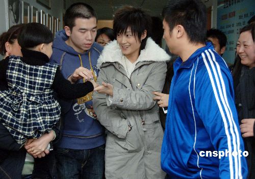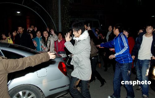 2007年12月16日晚,李宇春來到西安音樂臺接聽熱線,得到消息的百余名“玉米”蜂擁而至,爭相圍睹自己的偶像。中新社發(fā) 李海軍 攝