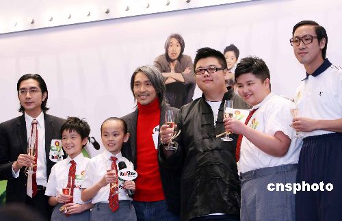 一月十四日,香港著名影星周星馳攜一眾演員出席記者會,為其導演的電影《長江7號》宣傳。蟄伏三年的喜劇巨星周星馳,執導具有特別效果的電影《長江7號》,將在本月三十一日上演。中新社發 洪少葵 攝