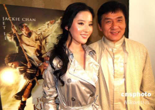 4月11日,美國好萊塢舉行由好萊塢功夫明星成龍、李連杰主演的新片《功夫之王》首眏式。圖為成龍與中國影壇女星劉亦菲出席首眏式。中新社發 盧威 攝