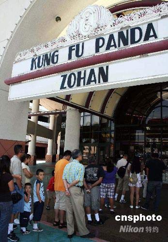 當地時間6月7日,由成龍和劉玉玲等好萊塢著名影星配音的動畫片《功夫熊貓》在美國洛杉磯各大影院上映。當地民眾排隊購票觀看新片。劉玉玲希望這部影片能借助2008北京奧運的“中國熱”問鼎北美票房。 中新社發 金立冬 攝
