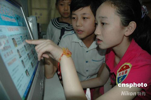6月17日下午,河南省南陽市第十八小學的少先隊員爭相在網上為“抗震救災英雄少年”投票。連日來,該校通過舉辦“做一個有道德的人”主題班、隊會等多種形式,組織小學生學習英雄少年的先進事跡和優秀品德,發動他們利用報紙、網絡為“抗震救災小英雄”投上神圣的一票。 中新社發 熊運彬 攝