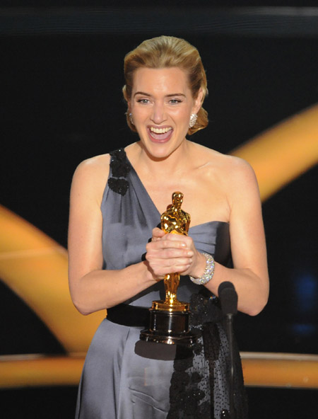 中新網2月23日電 美西時間2月22日下午17:00(北京時間2月23日上午9:00),第81屆奧斯卡金像獎頒獎典禮在洛杉磯柯達劇院舉行,當年在《泰坦尼克號》中飾演“露絲”一角而紅遍全球的女星凱特·溫斯萊特,今日第六次沖擊奧斯卡終于得償所愿。她憑借在《朗讀者》中的精湛演技而獲得第81屆奧斯卡最佳女主角,這位女星上臺領獎激動萬分,她說在八歲的時候曾經想象這一時刻,當時的獎杯只是一個香檳杯子!拔乙兄x我的家人,所有人。我不能忘記你們。我很幸福,擁有一個愛我的丈夫和漂亮的孩子。”