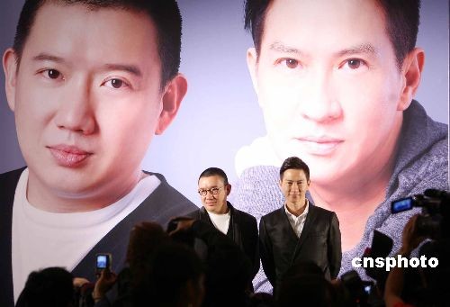 三月十二日,香港英皇娛樂集團在日航酒店舉行記者會,宣布影星張家輝(右)、杜汶澤加盟英皇電影。中新社發 洪少葵 攝