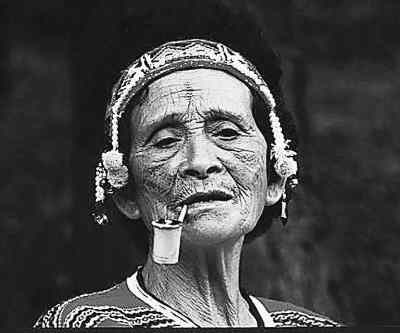 泰雅文化工作者田貴實先生告訴我們,對男子而言,文面是成年的標志,也是勇武的象征;對于女子,則是善于織布的標記。同時,文面還有辟邪、美觀和祖靈識別的作用,經過完整文面的泰雅男女生時受到族人的認可、敬重,死后則可順利通過“彩虹橋”,到達祖靈承諾的安息之鄉。但文面的風俗在日據時代被禁止,如今尚存的文面老人已不多(見圖)。
