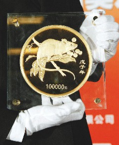 據(jù)臺(tái)灣《聯(lián)合報(bào)》報(bào)道,臺(tái)灣中華奧委會(huì)與北京奧運(yùn)紀(jì)念金幣代理商臺(tái)灣大洋金銀幣27日舉行“二○○八北京奧運(yùn)紀(jì)念金銀幣慈善拍賣會(huì)”,16組拍賣商品中,最受矚目的是重10公斤的“戊子鼠年紀(jì)念金幣”,金幣厚2.5公分、直徑18公分,拍賣底價(jià)為1220萬,最后以1225萬元賣出。