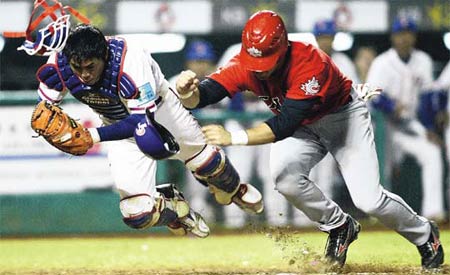 八局上,加拿大隊的凡歐斯崔德借隊友安打掩護(hù),想從二壘直沖本壘,中國臺北隊右外野手張建銘長傳又快又準(zhǔn),捕手葉君璋已等在本壘板前,不料凡歐斯崔德靠著一米九三、一百零二公斤壯碩身材,用兩手肘猛撞,把葉君璋彈開,葉全力護(hù)球,還是觸殺出局。