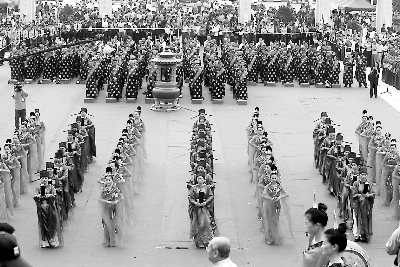 上午9點半,此次活動的重頭戲——保生大帝頌典儀式開始。在數通鳴鐘響鼓之后,兩列身著錦衣、手持斧鉞的古裝衛士沿著石階緩緩而下,海滄青礁慈濟宮理事長呂根銓、臺灣保生大帝信仰總會創會理事長廖武治作為主祭人,率領290座各地宮廟代表,在保生大帝神像前開始隆重的頌典儀式。詠讀頌文、獻花獻果、贊唱,吸收了祭孔、祭黃帝和祭媽祖的保生頌典儀式,讓現場的兩岸鄉親大飽眼福。頌典儀式上還進行了充滿懷古思緒的歌舞表演,身著多彩輕紗的舞者翩翩起舞,幾十人的古裝儀仗隊整齊排列于兩旁,盡顯盛大莊重的氣氛,也向現場所有來賓展示了中華文化的禮儀和鮮活的民俗文化。