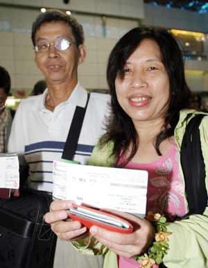 兩岸周末包機四日啟動,首班由臺北飛往上海的華航班機第一位報到旅客沈美珠(右)和陳進興(左),興奮展示登機證。 “中央社”圖
