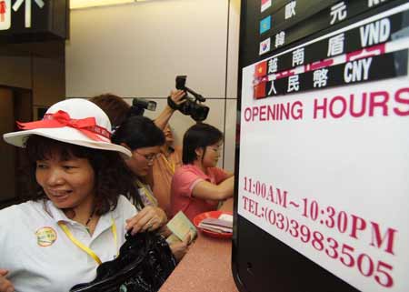 兩岸周末包機啟動,大陸赴臺觀光首發團四日揭幕,第一團從廣東出發的旅客在抵臺桃園機場時,立刻兌換新臺幣。 “中央社”圖