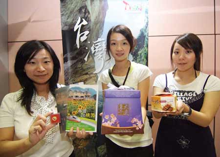 大陸觀光首發團四日抵臺,桃園縣也前往桃園機場宣傳桃園之美,其中包括宣傳大溪豆干、龍潭貢糖、慈湖觀光導覽。“中央社”圖
