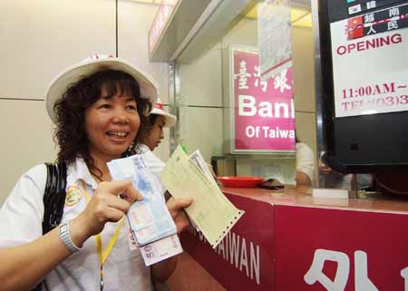 大陸觀光首發團四日來臺,廣東旅客拿人民幣兌換新臺幣時,心情相當興奮。“中央社”圖
