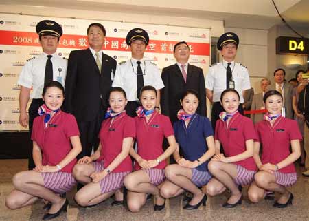 兩岸周末包機啟動,大陸居民赴臺觀光首發團四日上午在南方航空抵臺后,揭開歷史序幕,機組人員在機場留下難得畫面。 “中央社”圖
