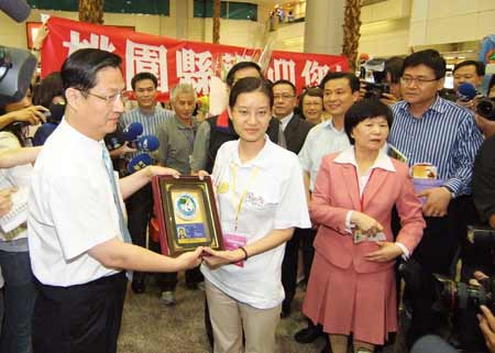 兩岸周末包機啟動,大陸居民赴臺觀光首發團四日抵臺,搭乘南方航空的香港城市大學的博士研究生陳婷婷(左二),經過計算機選號,成為首發團來臺第一人。 “中央社”圖