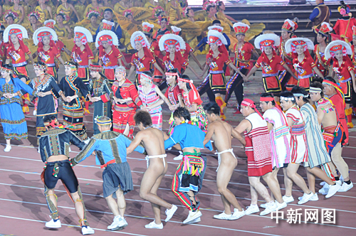 中新網泉州10月26日電 第六屆農民運動會今晚在福建省泉州市隆重開幕。圖為臺灣泰雅族、阿美族在開幕式上表演的“豐年祭”精彩舞蹈。