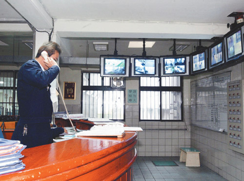 每個舍房門口都有管理員坐鎮(zhèn),從監(jiān)視器看陳水扁的一舉一動。另可從監(jiān)窗口查看,中央臺也有器作第二線監(jiān)事。圖片來源:臺灣《聯(lián)合報》