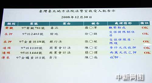 臺北地方法院從12月29日下午2時起召開陳水扁羈押庭,經過長達12多小時的庭訊、評議后,合議庭審判長蔡守訓30日2時25分裁定將陳水扁羈押,但不禁見。圖為臺北地方法院法警室的收受人犯告示電視屏幕顯示陳水扁被裁定收押。(圖文/中新社記者 陳立宇/攝)