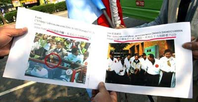 國親聯盟臺中一位支持者在CNN及蕃薯網站上,下載圖片比對阿扁遭槍擊始末圖片,提出阿扁中槍時夾克有血跡,但進入醫院前卻沒有,質疑槍擊作假。