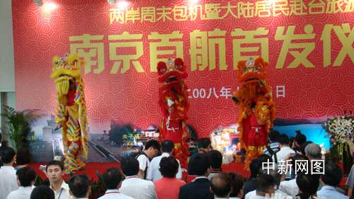 中新網南京7月4日電(記者 丁梅 朱曉穎)伴隨喧天的鑼鼓聲,三只金黃、大紅“獅子”跳上舞臺。今日早晨七點,兩岸周末包機南京首航暨大陸居民赴臺旅游首發儀式在南京祿口國際機場隆重舉行。