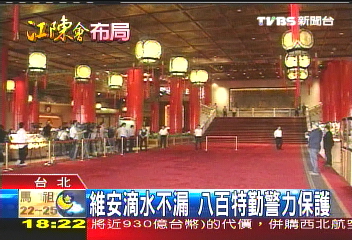 據臺灣TVBS報道,這回光是警力,“警政署”就動員七千人次負責安全。從飯店牌樓,一直到大廳,都有便衣刑警站崗,同時后方的停車場,還有支持保警24小時待命。