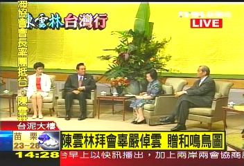 陳云林拜會(huì)辜嚴(yán)倬云,追思辜振甫推動(dòng)兩岸關(guān)系的精神;辜嚴(yán)倬云首先贈(zèng)上張大千的名作“和鳴鳥圖”給陳云林,象征兩岸“合鳴”。