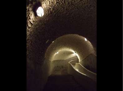 記者當(dāng)日潛入探險(xiǎn)的即為西密道。這條看似簡單的密道長180米,高210公分、寬223公分,有86臺階、45個防爆燈,滑梯90米長,還設(shè)有獨(dú)立電源、空調(diào)、排水、緊急廣播。建材則是防爆白洋灰、鋼筋水泥。密道坡度很陡,一路走下,就彷佛進(jìn)入了時光隧道,四周昏暗慘白的氛圍,嘿,還真感覺到一些風(fēng)聲鶴唳的緊張氣氛。雖說從建好到現(xiàn)在,密道完全沒有使用過,詭異的是,光滑的溜滑梯上卻留有許多黑色長條刮痕,難道是人沒使用過,卻曾運(yùn)輸過槍械軍火?