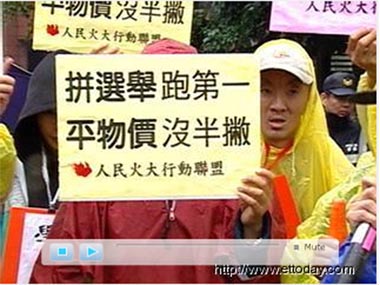 中新網11月6日電 臺灣民間團體“人民火大行動聯盟”6日著帶著蔬果、雞蛋到當局“行政院”前抗議。行動聯盟并列舉“高官何不食肉糜 言行錄”,其中陳水扁、呂秀蓮、“行政院副院長”邱義仁、“行政院經建會”主委何美玥等都榜上有名。