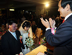 包括蕭萬長、郝龍斌等政界人士,11日也來現(xiàn)場“沾喜氣”。自稱是“專業(yè)證婚人”的馬英九,擔任證婚人。經驗十足的他,證婚不忘宣揚政策,要求兩人一定要生足三個;因為只要是臺北市民生的第三個孩子,市政府將補助尿布錢。