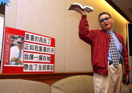 中新網11月21日電 無黨籍“立委”李敖20日告別政壇,他留下來的代表作就是他的新書“議壇哀思錄”,取這個名字,李敖說,就是指別人都死了,只有他還活著。書中還大爆“立院”同僚們的料,像是未婚的女“立委”李紀珠還是處女,而邱毅在“上床”前,還要先讀他的著作。