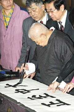 六歲習(xí)字,曾在“總統(tǒng)府”為蔣介石寫帖子、格言,50多歲開(kāi)始教授書(shū)法的楊家麟,昨天在學(xué)生簇?fù)硐拢檬帜ㄆ叫垼瑵?rùn)潤(rùn)筆,凝氣重新寫下“大中至正”,就跟掛在牌樓上近30年的字體一模一樣。