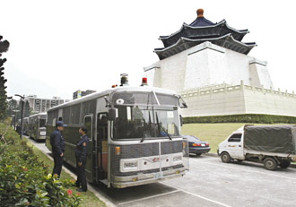 昨天中午,臺“警政署”保安組呂姓專員帶隊前往中正紀(jì)念堂勘查,隨即以四輛中型巴士載了120名保警進(jìn)駐到傍晚,確定今天以前不會進(jìn)行牌匾拆除工作后,只留下40名保警輪班鎮(zhèn)守。