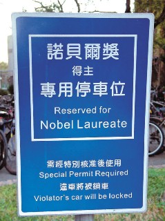 這個專屬停車位,位在臺大小椰林大學旁的“中研院”原分所后方。停車位旁還樹立了一個醒目的標示牌,藍底白字用中英文寫著“諾貝爾獎得主專用停車位”,上頭還注明“需經特別核準后使用,違車將被鎖車”。