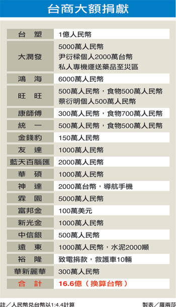 至昨天為止,臺灣企業(yè)及企業(yè)主承諾捐款金額已突破二十億新臺幣,創(chuàng)臺商對大陸單一天災(zāi)捐款紀(jì)錄。