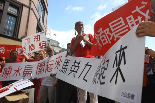 林正杰(右)十日帶領(lǐng)一群紅衫軍成員在臺(tái)“雙十”大會(huì)現(xiàn)場(chǎng)外圍,高舉標(biāo)語海報(bào),要馬英九硬起來,同時(shí)呼吁特偵組盡快將陳水扁抓起來。(“中央社”圖)