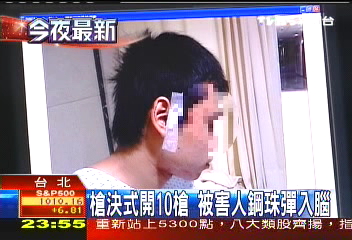 據臺灣TVBS報道,從鬼門關走了回來的被害人,太陽穴上還包著白色紗布,到現在還有一顆鋼珠彈留在腦部,等待手術取出來。只因為向老板說同事工作不認真,被害人就被像近乎處決的方式遭到連開10槍。