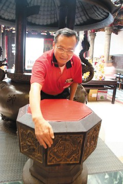 蘆竹鄉南崁五福宮的八卦天爐,相傳是古代匯集財氣的神物,最近景氣低迷、股市不振,八卦天爐的人氣比過去更旺。 (圖片來源:臺灣《聯合報》)