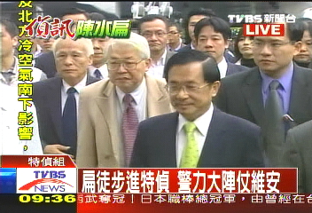陳水扁抵達(dá)臺檢方特偵組應(yīng)訊。圖片來源:臺灣TVBS