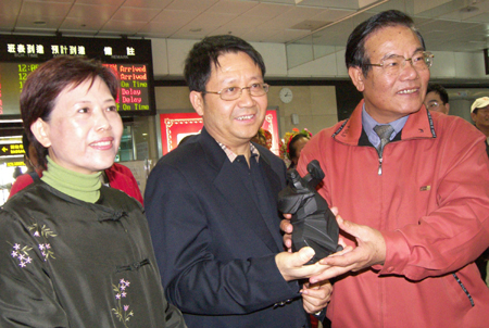 泉州天后宮澎湖參訪團成員林林(中)二十八日抵澎湖馬公機場,是“小三通”第一千名訪澎的大陸旅客。圖為澎湖縣長王干發(右)致贈紀念品,左為澎湖縣議會議長劉陳昭玲。“中央社”圖 高茂雄 攝