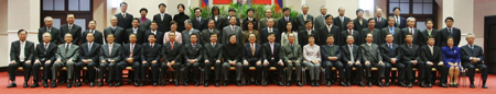 臺(tái)灣當(dāng)局“行政院”二十四日下午加開(kāi)臨時(shí)“院會(huì)”,通過(guò)總辭案。“行政院長(zhǎng)”張俊雄和全體成員拍“畢業(yè)照”留念。面對(duì)媒體關(guān)切和詢問(wèn),他不愿發(fā)表意見(jiàn)。“中央社”圖 蘇圣斌 攝