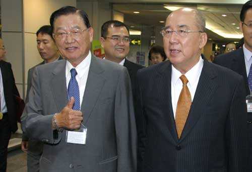 中國國民黨主席吳伯雄(右)五月三十一日結束在大陸的訪問行程返臺,海基會董事長江丙坤(左)特別前往接機,并豎起大拇指高度肯定此行的成果。(“中央社”圖)