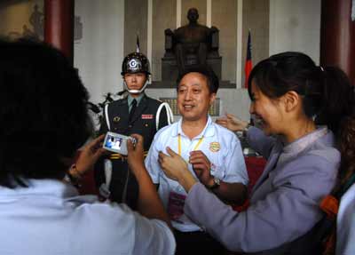 兩岸周末包機(jī)四日啟動,廣州首發(fā)旅游團(tuán)抵臺后即前往臺北“國父紀(jì)念館”參觀,正好看到三軍儀隊(duì)表演,感到很興奮,手中相機(jī)拍不停。