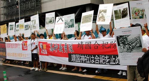 據臺灣《聯合報》報道,一行50多人于中午時分前往日本國會議事堂旁邊的參議員會館前,高舉控訴日本殖民時期迫害臺灣少數民族的巨大布條及歷史照片,高喊“拒絕參拜”、“還我祖靈”、“日本反省、謝罪和賠償”等口號,表達他們對日本的抗議。