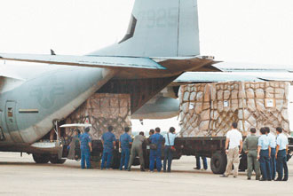 據了解,這批美方捐助的大型防水布,是美國海軍陸戰(zhàn)隊使用的特殊軍用品,可以在災區(qū)興建組合屋時鋪在地上防水、防雨之用。