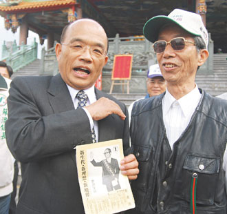 中新網11月4日電 臺當局前“行政院長”蘇貞昌3日到宜蘭輔選,在蘇澳遇到支持者林阿山,該人拿出30年前蘇貞昌參選的老文宣跟他要簽名。蘇貞昌看著當年文宣上的照片,幽默地說“證明我以前是有頭發的”,在場的人都笑翻了。