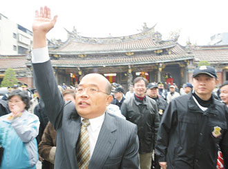 中新網3月3日電 據臺灣《聯合報》報道,民進黨戰將蘇貞昌昨天(二日)到民進黨中央當面向黨主席蔡英文表達參選臺北市長意愿,蘇貞昌今天上午十一時將在臺北市保安宮正式宣布參選,為民進黨“雙城大戰”開出第一槍,臺北市將上演“郝、蘇對決”。