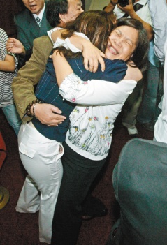 臺“立法院”審查陸生來臺法案,擔任主席的國民黨“立委”趙麗云(左)宣布會議開始,卻被民進黨“立委”管碧玲(右)用力抱住,兩人抱成一團,表情痛苦。圖片來源:聯合報