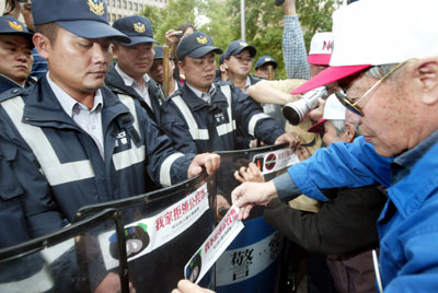 上午也有反“公投入聯(lián)”行動聯(lián)盟赴“中選會”外陳情,不僅以行動劇表達堅決反對“總統(tǒng)”、“立委”與“公投”票一次領(lǐng)、投票的訴求,還將“拒領(lǐng)公投票”貼紙貼在了警方盾牌上。