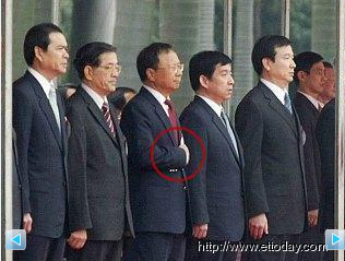 中新網1月28日電 在28日的一項“外事”活動上,臺當局“行政院長”張俊雄率“部會首長”與會。媒體記者發現,在儀式行禮過程中,陳水扁以扶手禮致敬時,“內閣”成員個個比法大不同,“教育部長”杜正勝則是給自己升官,也比了扶手禮,而“總統府副秘書長”陳其邁與“新聞局長”謝志偉則是變成了軍官,沒戴帽卻比出舉手禮。