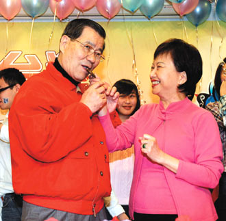 蕭萬長(左)昨天參加摯愛臺灣甜蜜情人節活動,與夫人朱俶賢(右)甜蜜喂食巧克力。