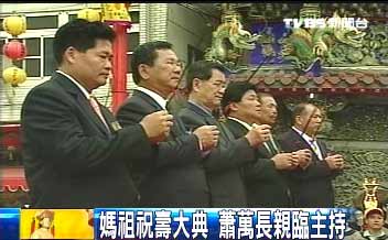 身為嘉義子弟的蕭萬長,在家鄉奉天宮感性致詞,感謝媽祖的保佑、民眾的支持,讓“大選”順利進行,并祈求兩岸和平。