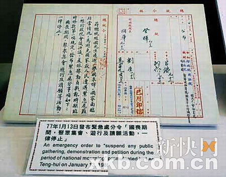 臺(tái)“總統(tǒng)府”9日上午開放民眾參觀,展覽室內(nèi)展出歷任“總統(tǒng)”文物及公文稿,據(jù)臺(tái)灣媒體9日?qǐng)?bào)道,其中包括1988年蔣經(jīng)國(guó)逝世時(shí),馬英九受命用毛筆撰寫的緊急處分令真跡,規(guī)范在“國(guó)喪”期間,全臺(tái)禁止聚眾集會(huì)、游行、請(qǐng)?jiān)傅然顒?dòng),當(dāng)時(shí)馬英九是“總統(tǒng)府”第一局副局長(zhǎng),簽出來的文稿還要層層上報(bào),由長(zhǎng)官批示,最后由繼任“總統(tǒng)”的李登輝批定。